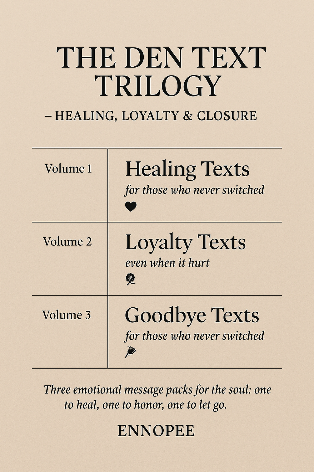 The Den Text Trilogy is a complete 3-volume collection of 90 emotionally charged messages designed to help you heal heartbreak, honor loyalty, and say goodbye with grace. Each volume speaks to a different chapter of the heart — from healing, to holding on, to letting go. Whether you’re comforting a friend, celebrating someone loyal, or ending something quietly, these texts offer raw, elegant words for the soul. Includes all 3 digital downloads + a bonus “How to Use Den Texts” guide. Built for deep feelers, loyal lovers, and silent warriors. This isn’t content. This is closure. Connection. Clarity. Welcome to The Den. We build in silence. We deliver with fire. – Ennopee