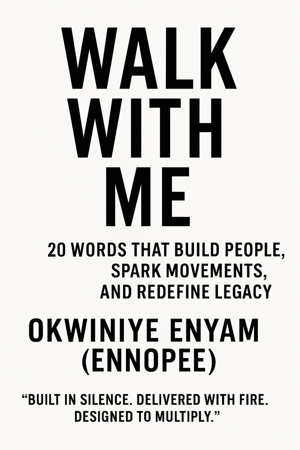 WALK WITH ME: 20 Words That Build People, Spark Movements, and Redefine Legacy by Okwiniye Enyam (Ennopee) “Built in silence. Delivered with fire. Designed to multiply.” This is more than a book. It’s a blueprint for builders, leaders, creators, and kingdom carriers. Inside are 20 deeply crafted chapters—each one a transformational word designed to awaken alignment, unlock legacy, and activate a rhythm that multiplies. From identity and impact to clarity, conviction, and consistency—WALK WITH ME is a one-of-a-kind journey that mirrors, mentors, and mobilizes anyone ready to build what lasts. Each chapter includes: • A one-line hook • A powerful personal + leadership breakdown • Business & individual examples • A visual metaphor • Reflection questions • A “Legacy Action” you can apply right away If you’ve been called to lead in silence, build what doesn’t yet exist, or carry something the world has yet to see—this is your next step. This isn’t a book to just read. It’s a walk to live.